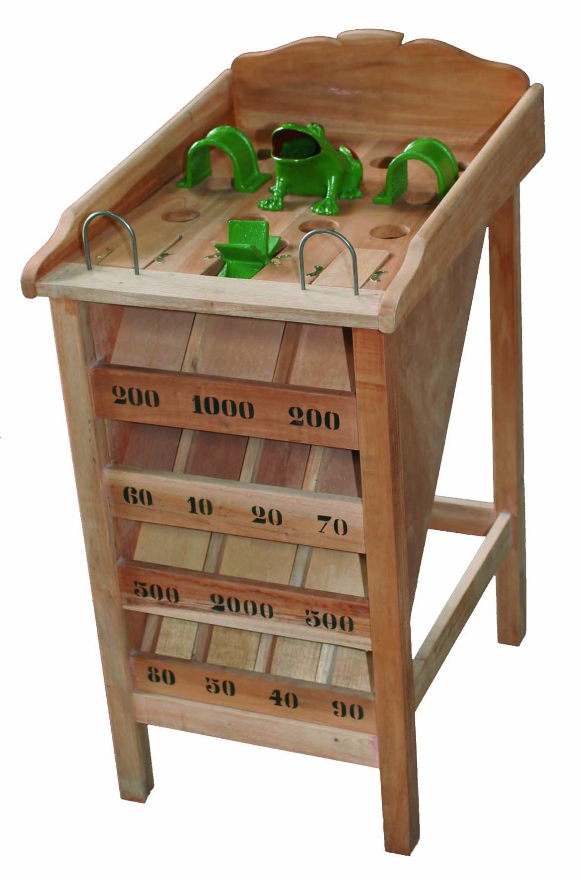 La grenouilleLe but du jeu est de marquer le maximum de points, en lançant 8 palets en fonte, à une distance d'au moins 3 mètres, dans les différents trous du jeu. A chaque trou correspond un casier avec un nombre de points. La grenouille aboutissant bien sûr au nombre de points le plus élevé. |